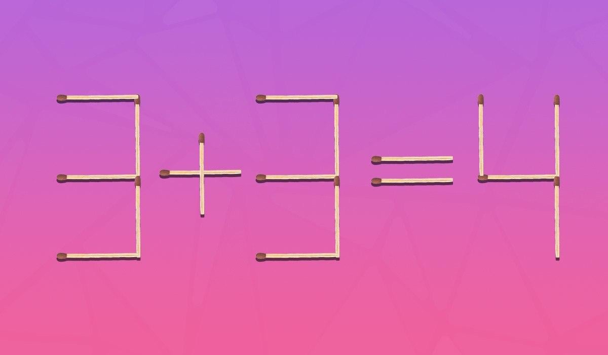 Spodaj si lahko ogledate sliko, na kateri je enakost 3+3=4 razložena z vžigalicami. Z matematičnega vidika je napačna, saj bi moral biti odgovor šest.