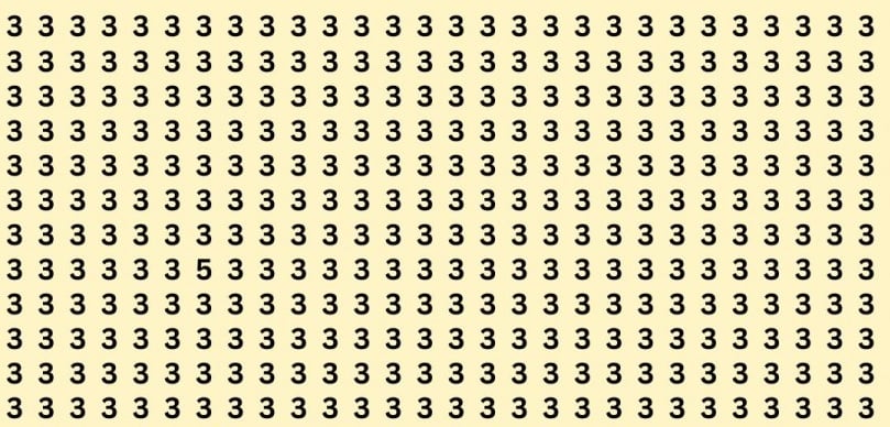 Na sliki vidimo veliko število številk 3, ki so razporejene v vrsticah in stolpcih. Na prvi pogled se zdi, da med njimi ni razločevalnih številk, vendar v resnici ni tako. Nekje neopazno se skriva petica, ki jo bo težko najti.